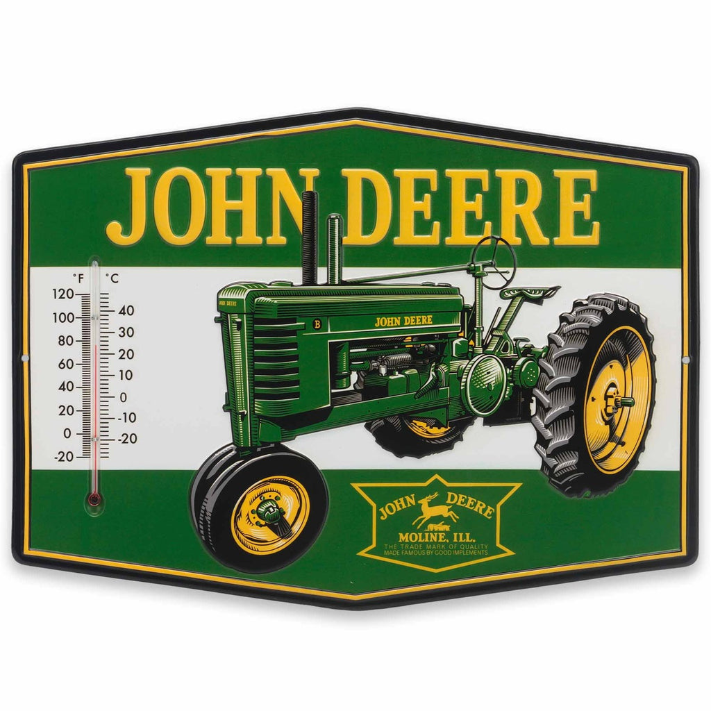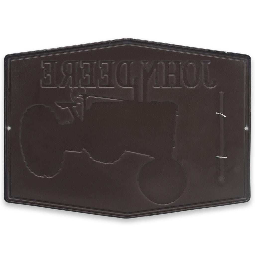 Stay on top of the weather in style with this officially licensed John Deere die-cut embossed metal thermometer. Featuring vibrant silkscreen graphics, this thermometer is perfect for both indoor and outdoor use, adding a rustic and functional touch to any space.