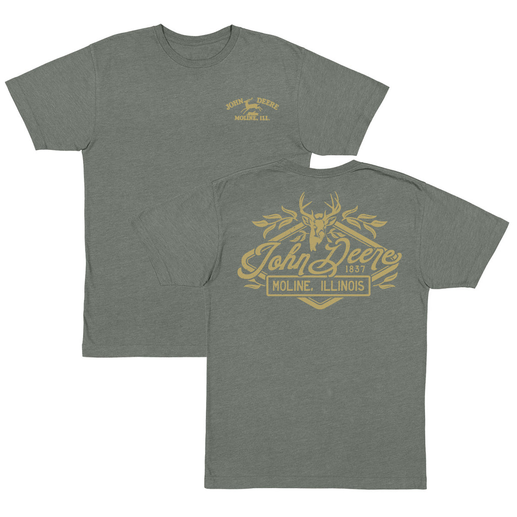 Comfortable everyday wear in a versatile olive heather blend. This classic John Deere script tee pairs 50% cotton with 50% polyester for durability and easy care. Perfect for fans of the iconic brand.